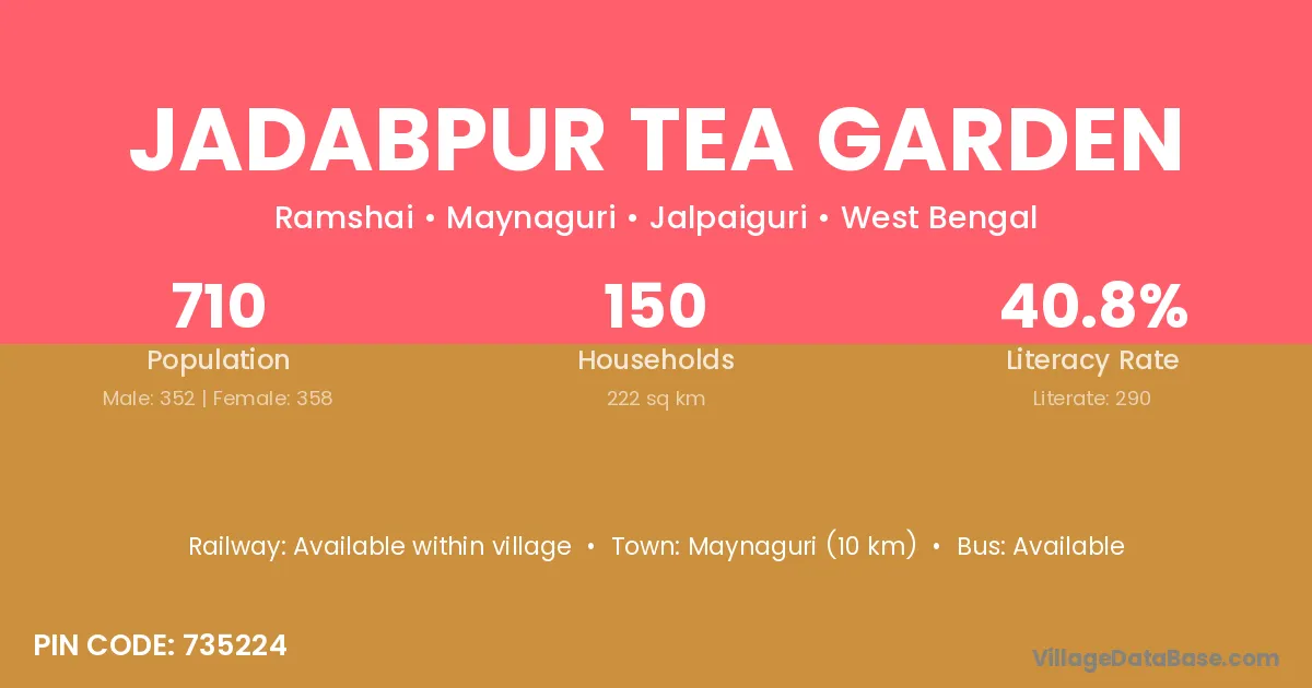 Jadabpur Tea Garden village has a total population of 710 people, of which 352 are males and 358 are females.