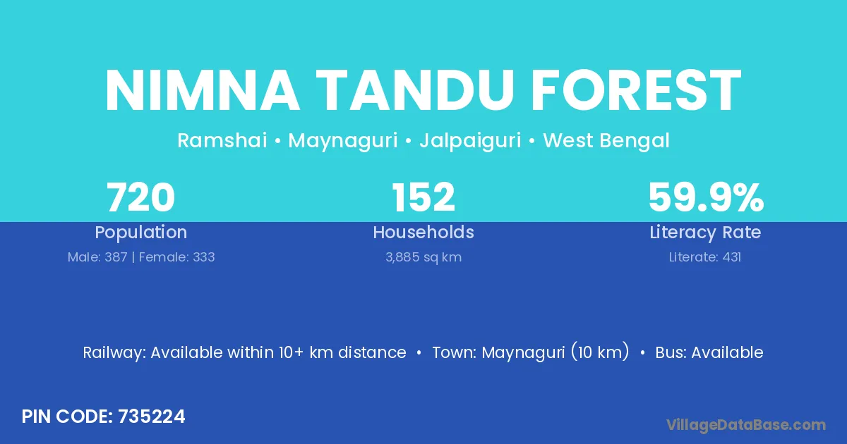Maynaguri (10 km) is the nearest town to Nimna Tandu Forest village for major economic activities and is located approximately 10 km away.