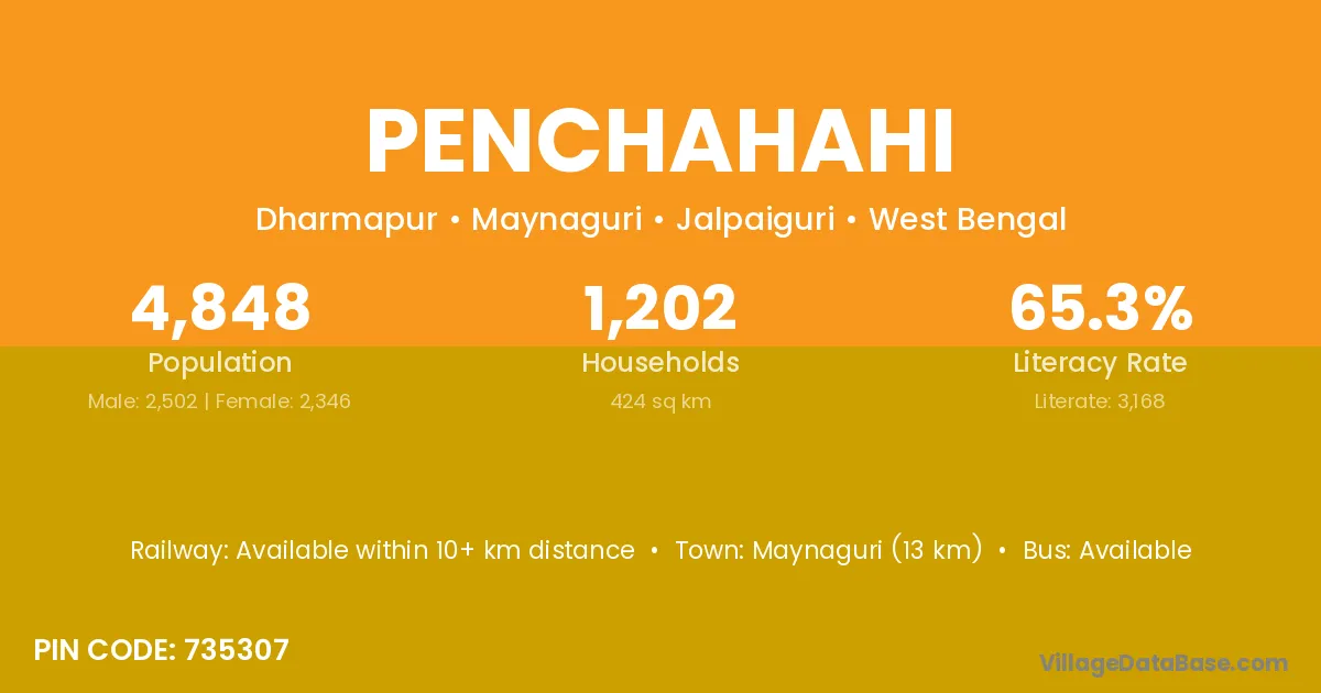 Maynaguri (13 km) is the nearest town to Penchahahi village for major economic activities and is located approximately 13 km away.