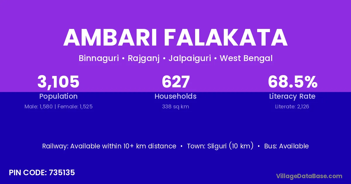 Sliguri (10 km) is the nearest town to Ambari Falakata village for major economic activities and is located approximately 10 km away.