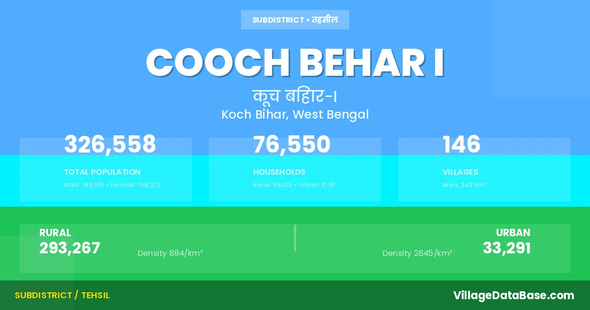 According to the 2011 census The total area of Cooch Behar I Subdivision is 343 km², with a population of 326558 people. The population density is 951 inhabitants per square kilometre, and there are approximately 76550 houses in the sub district.