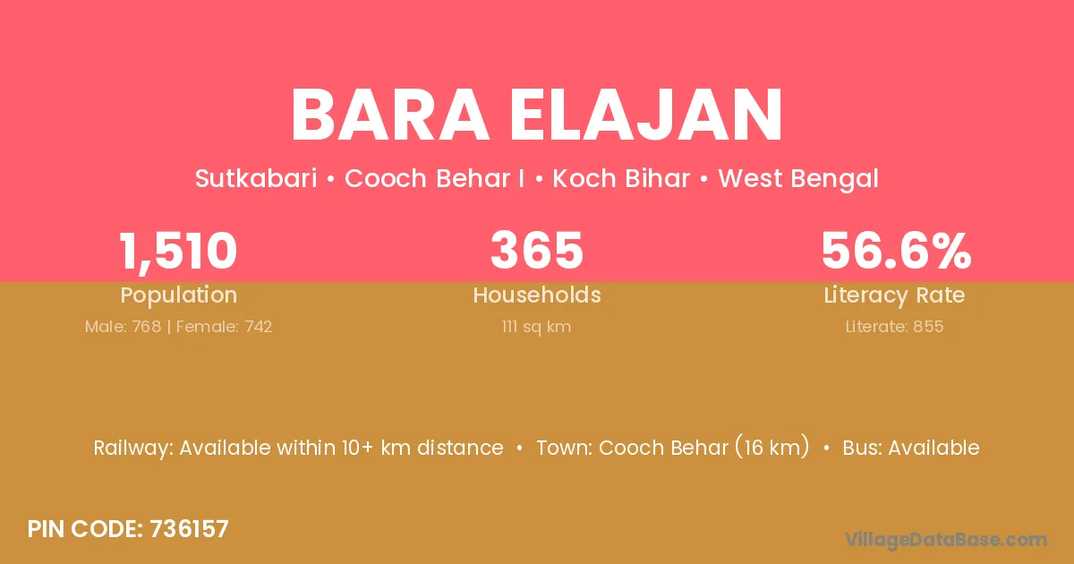 Cooch Behar (16 km) is the nearest town to Bara Elajan village for major economic activities and is located approximately 16 km away.
