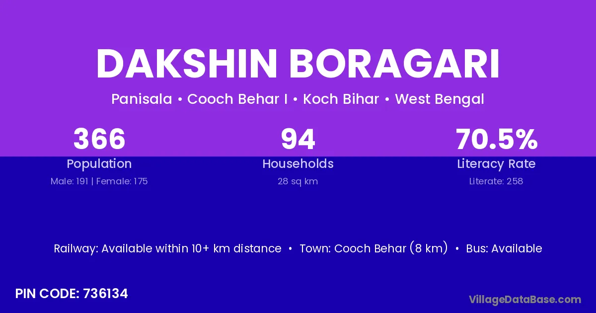 Cooch Behar (8 km) is the nearest town to Dakshin Boragari village for major economic activities and is located approximately 8 km away.
