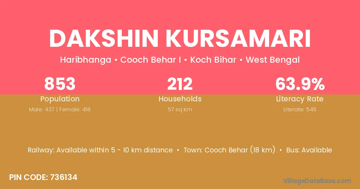 Cooch Behar (18 km) is the nearest town to Dakshin Kursamari village for major economic activities and is located approximately 18 km away.