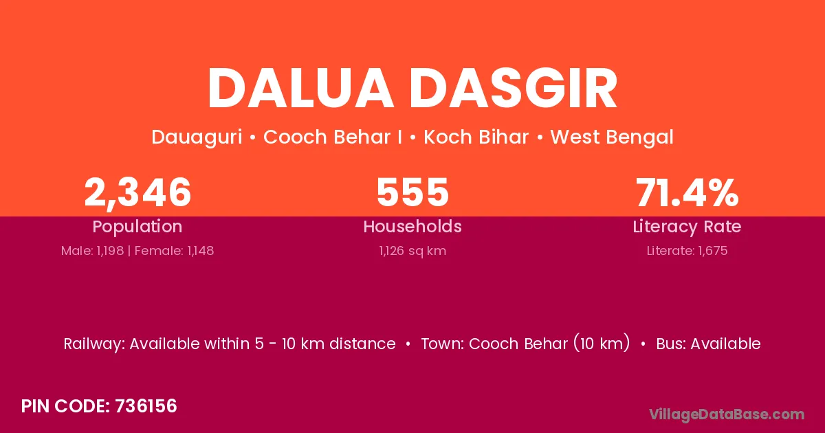 Cooch Behar (10 km) is the nearest town to Dalua Dasgir village for major economic activities and is located approximately 10 km away.