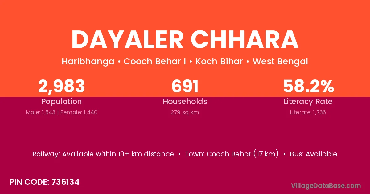 Cooch Behar (17 km) is the nearest town to Dayaler Chhara village for major economic activities and is located approximately 17 km away.