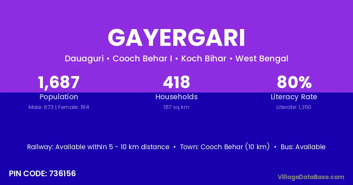 Cooch Behar (10 km) is the nearest town to Gayergari village for major economic activities and is located approximately 10 km away.