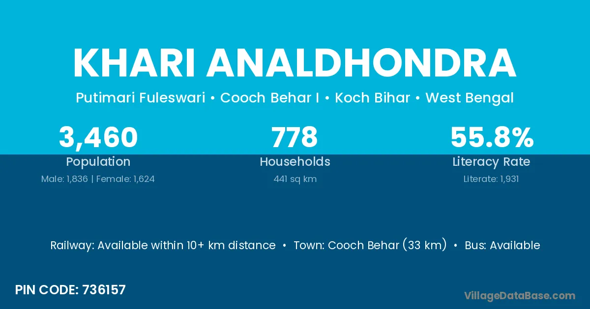 Cooch Behar (33 km) is the nearest town to Khari Analdhondra village for major economic activities and is located approximately 33 km away.