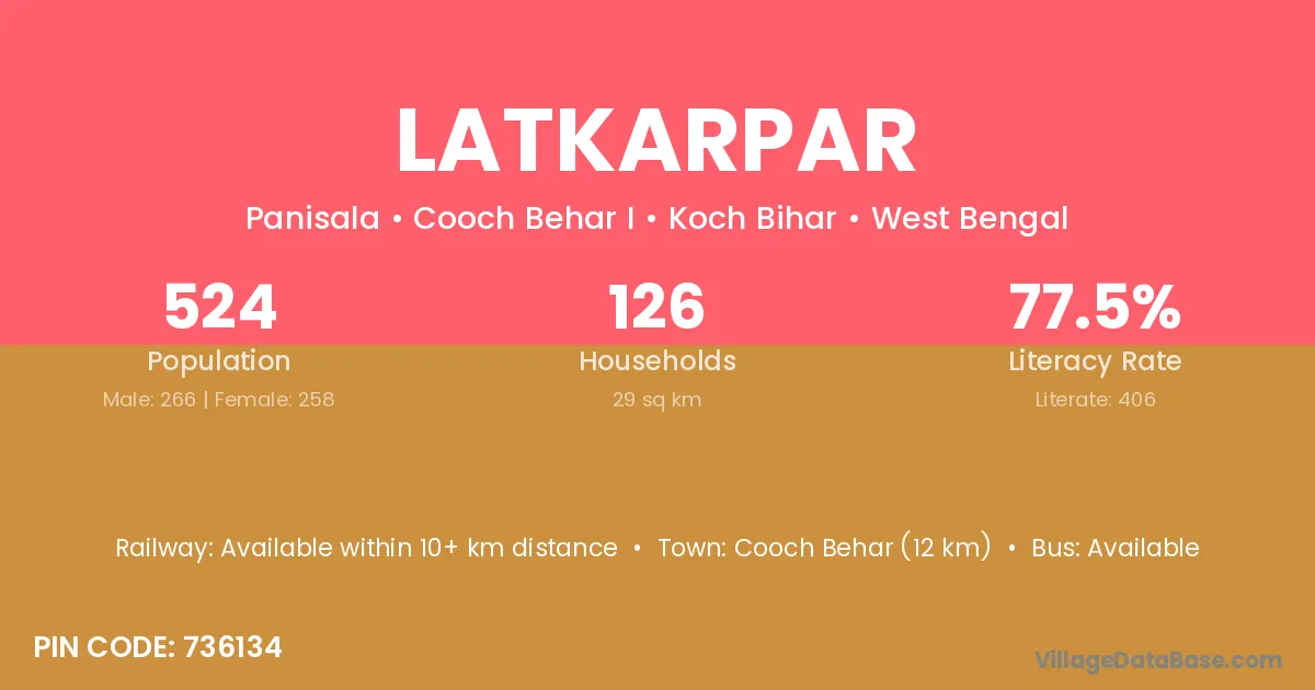 Cooch Behar (12 km) is the nearest town to Latkarpar village for major economic activities and is located approximately 12 km away.