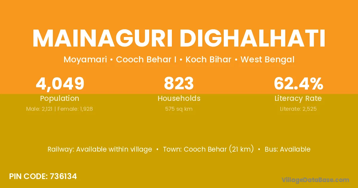 Cooch Behar (21 km) is the nearest town to Mainaguri Dighalhati village for major economic activities and is located approximately 21 km away.