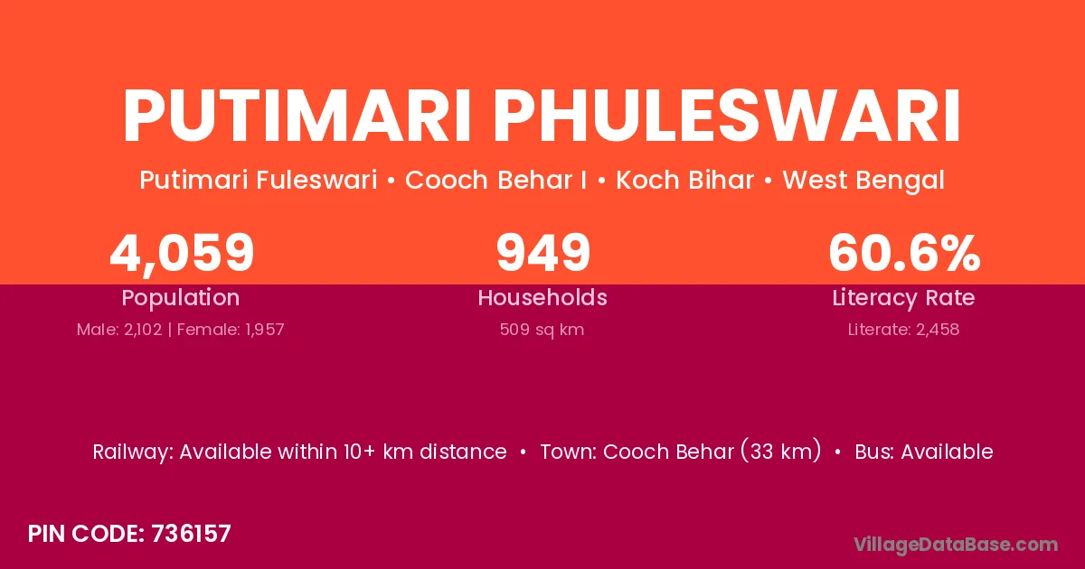 Cooch Behar (33 km) is the nearest town to Putimari Phuleswari village for major economic activities and is located approximately 33 km away.