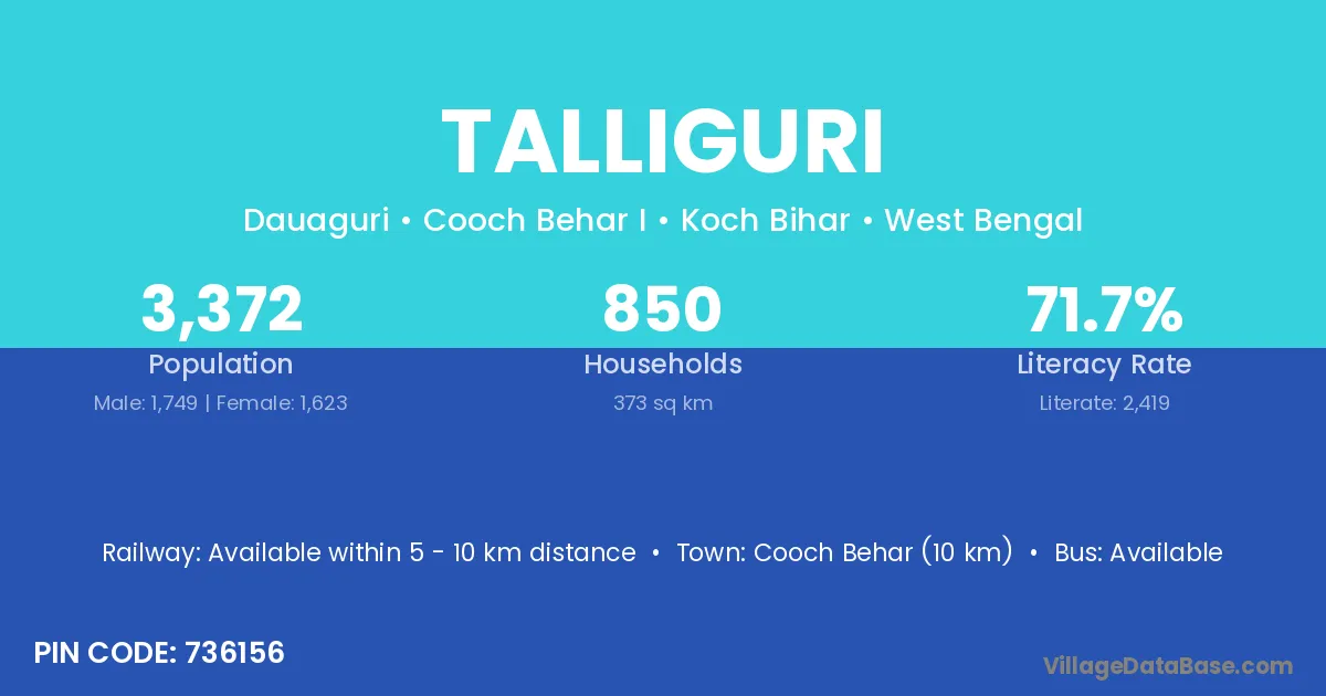 Cooch Behar (10 km) is the nearest town to Talliguri village for major economic activities and is located approximately 10 km away.