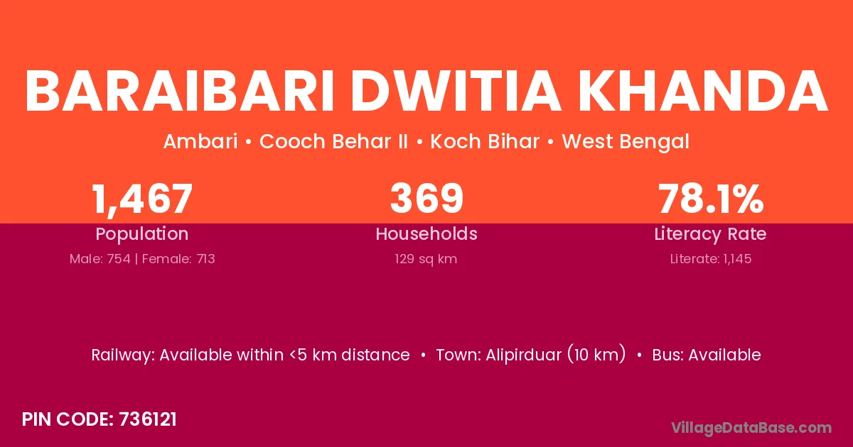 Baraibari Dwitia Khanda village has a total population of 1,467 people, of which 754 are males and 713 are females.