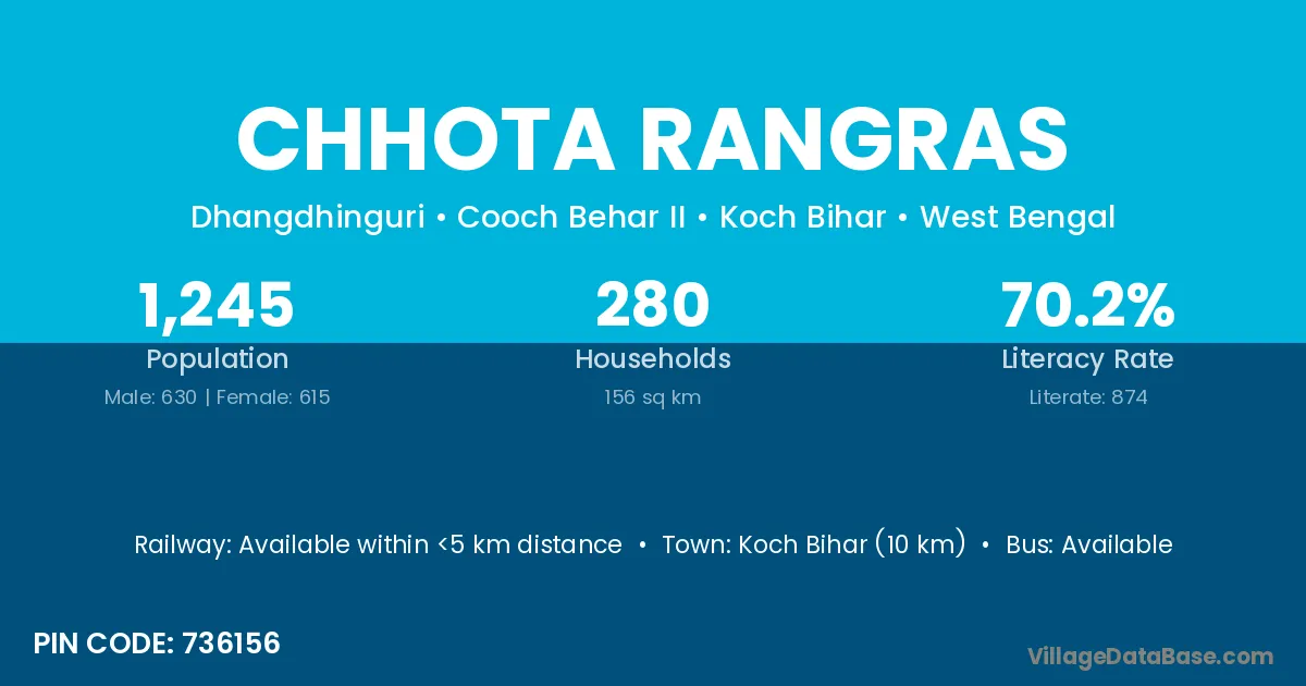 Koch Bihar (10 km) is the nearest town to Chhota Rangras village for major economic activities and is located approximately 10 km away.