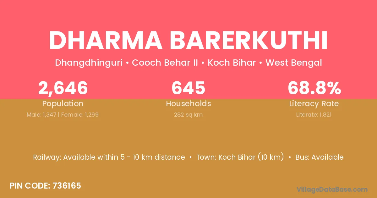 Koch Bihar (10 km) is the nearest town to Dharma Barerkuthi village for major economic activities and is located approximately 10 km away.