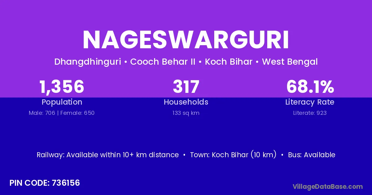 Koch Bihar (10 km) is the nearest town to Nageswarguri village for major economic activities and is located approximately 10 km away.