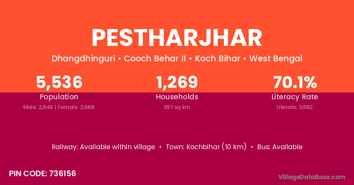 Kochbihar (10 km) is the nearest town to Pestharjhar village for major economic activities and is located approximately 10 km away.