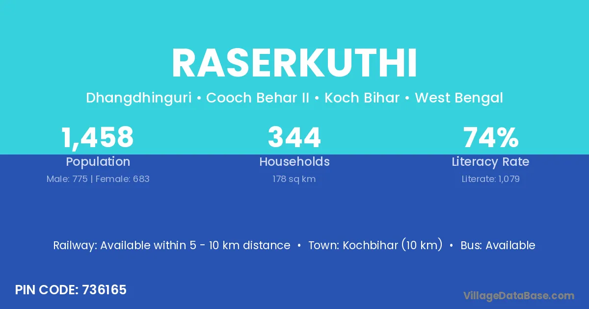 Kochbihar (10 km) is the nearest town to Raserkuthi village for major economic activities and is located approximately 10 km away.
