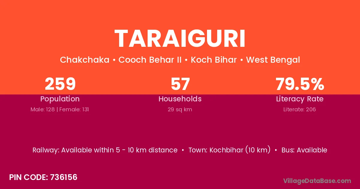 Kochbihar (10 km) is the nearest town to Taraiguri village for major economic activities and is located approximately 10 km away.