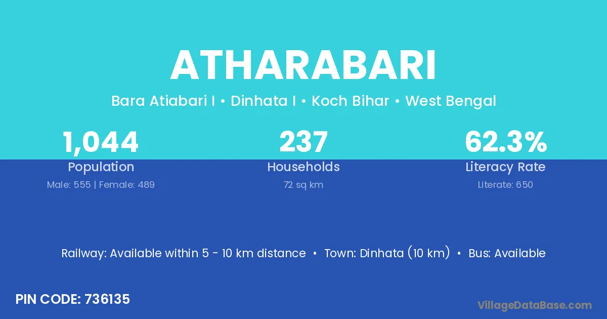 Dinhata (10 km) is the nearest town to Atharabari village for major economic activities and is located approximately 10 km away.