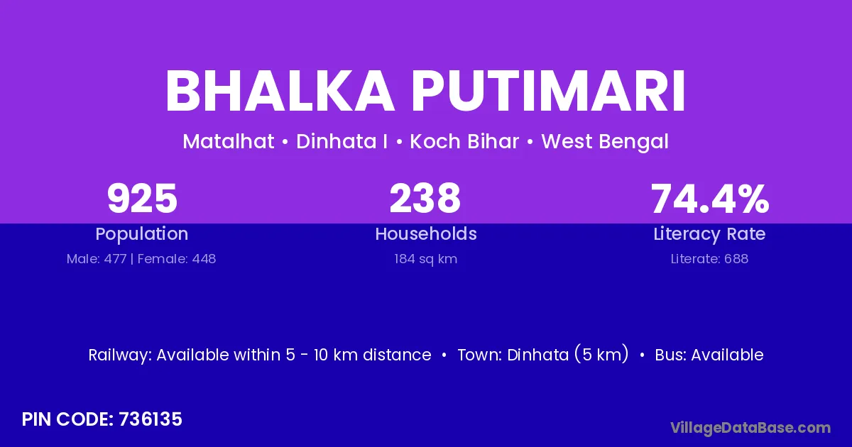 Dinhata (5 km) is the nearest town to Bhalka Putimari village for major economic activities and is located approximately 5 km away.