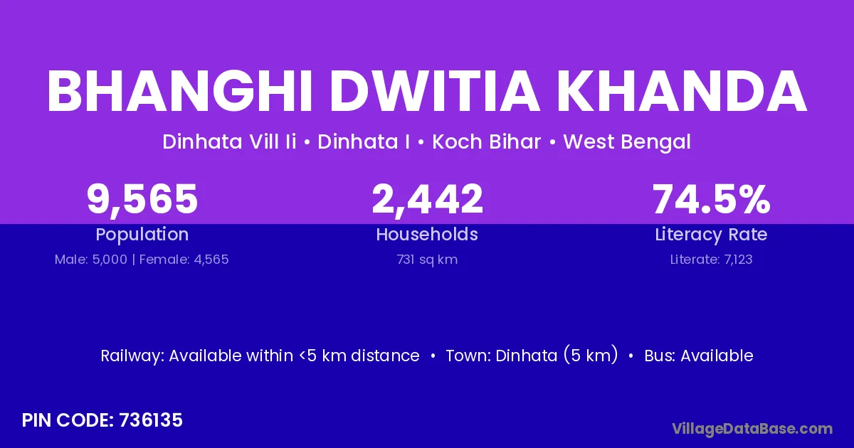 Dinhata (5 km) is the nearest town to Bhanghi Dwitia Khanda village for major economic activities and is located approximately 5 km away.