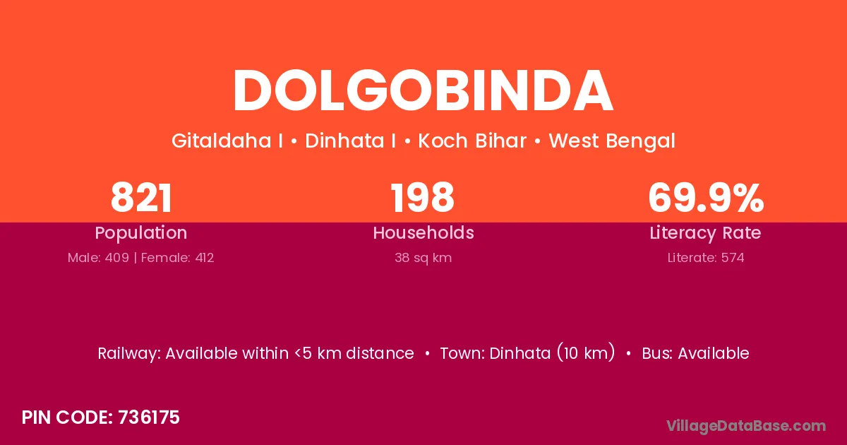 Dinhata (10 km) is the nearest town to Dolgobinda village for major economic activities and is located approximately 10 km away.