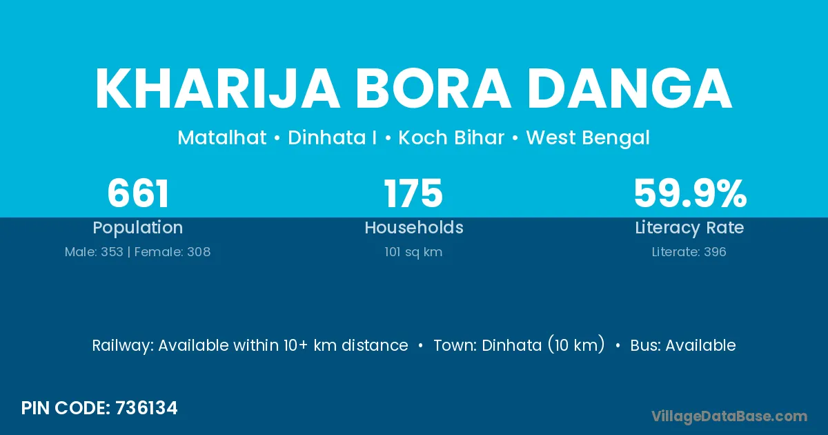 Dinhata (10 km) is the nearest town to Kharija Bora Danga village for major economic activities and is located approximately 10 km away.