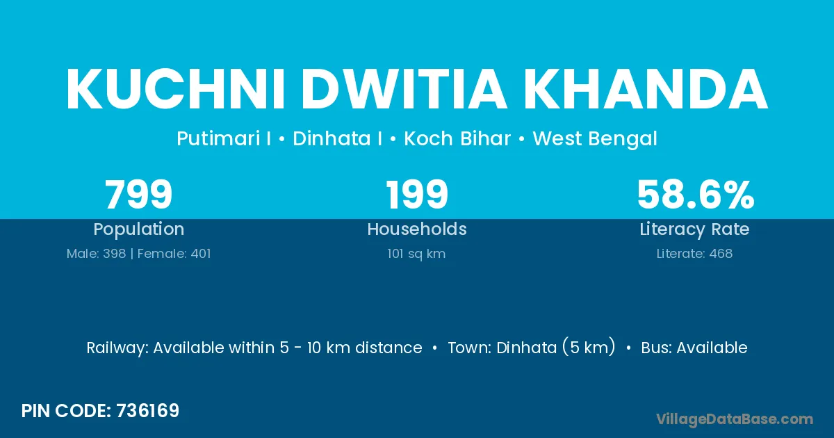 Dinhata (5 km) is the nearest town to Kuchni Dwitia Khanda village for major economic activities and is located approximately 5 km away.