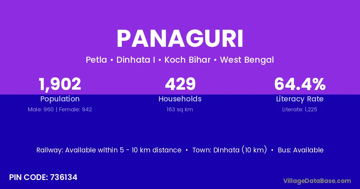 Dinhata (10 km) is the nearest town to Panaguri village for major economic activities and is located approximately 10 km away.