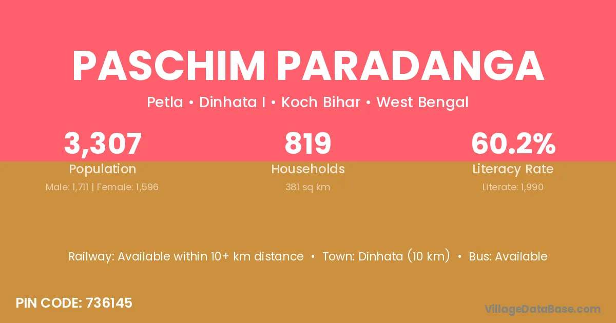 Dinhata (10 km) is the nearest town to Paschim Paradanga village for major economic activities and is located approximately 10 km away.
