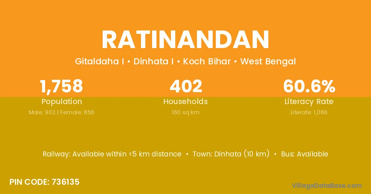 Dinhata (10 km) is the nearest town to Ratinandan village for major economic activities and is located approximately 10 km away.