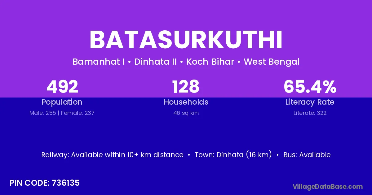 Dinhata (16 km) is the nearest town to Batasurkuthi village for major economic activities and is located approximately 16 km away.