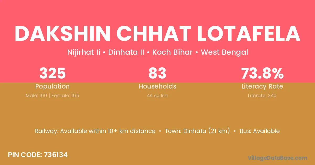 Dinhata (21 km) is the nearest town to Dakshin Chhat Lotafela village for major economic activities and is located approximately 21 km away.