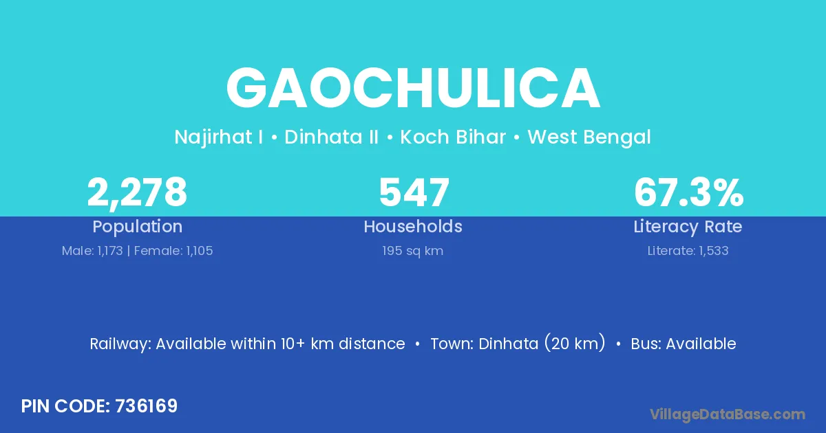 Dinhata (20 km) is the nearest town to Gaochulica village for major economic activities and is located approximately 20 km away.