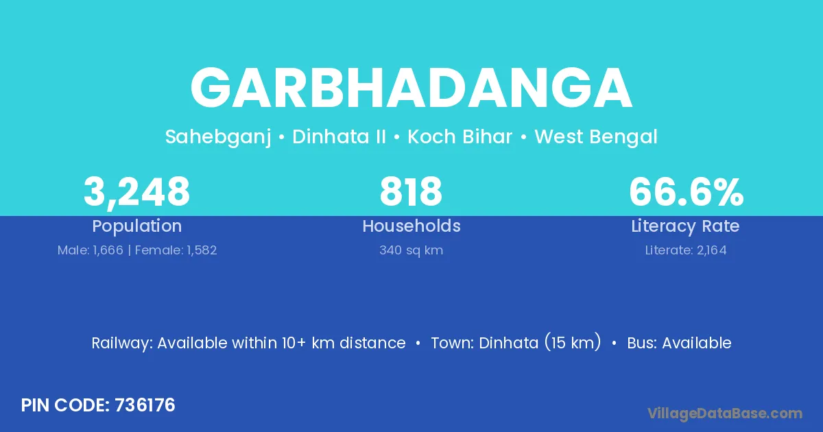 Dinhata (15 km) is the nearest town to Garbhadanga village for major economic activities and is located approximately 15 km away.