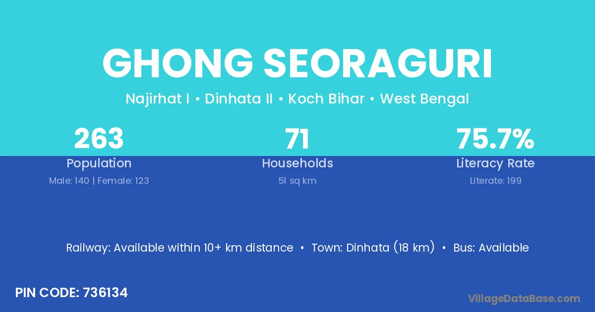 Dinhata (18 km) is the nearest town to Ghong Seoraguri village for major economic activities and is located approximately 18 km away.