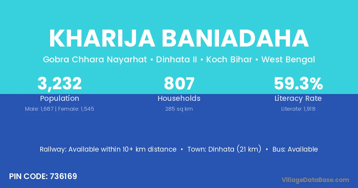 Dinhata (21 km) is the nearest town to Kharija Baniadaha village for major economic activities and is located approximately 21 km away.