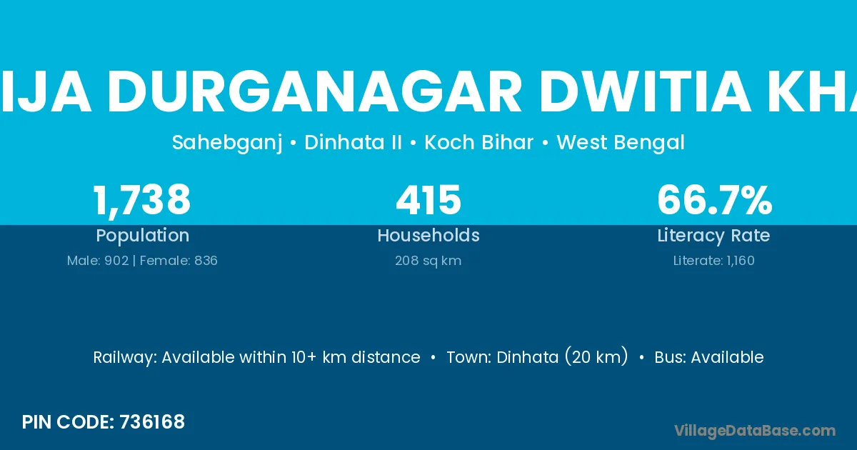 Dinhata (20 km) is the nearest town to Kharija Durganagar Dwitia Khanda village for major economic activities and is located approximately 20 km away.