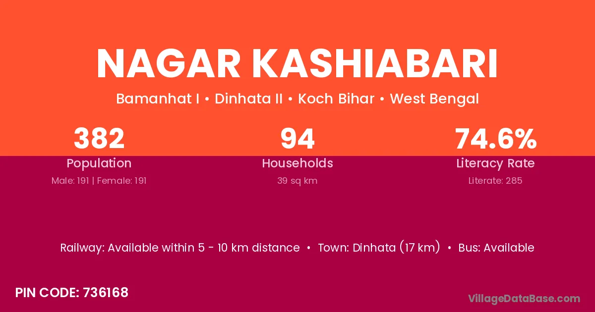 Dinhata (17 km) is the nearest town to Nagar Kashiabari village for major economic activities and is located approximately 17 km away.
