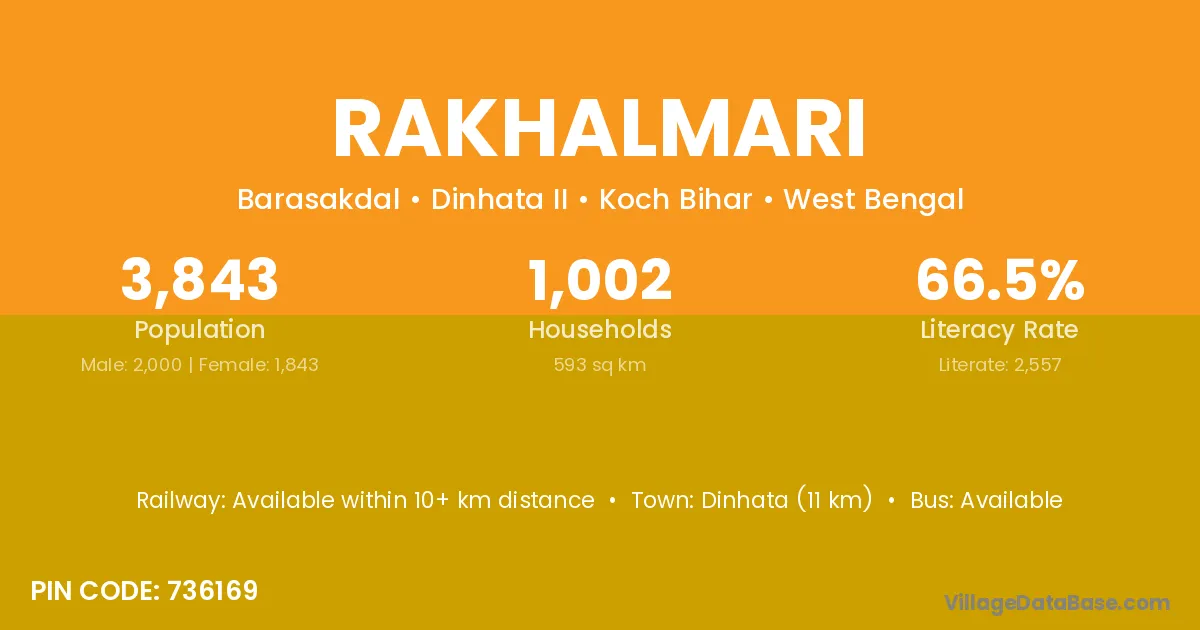 Dinhata (11 km) is the nearest town to Rakhalmari village for major economic activities and is located approximately 11 km away.