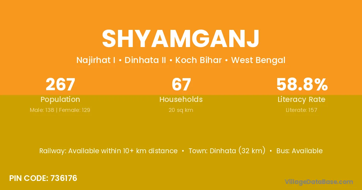 Dinhata (32 km) is the nearest town to Shyamganj village for major economic activities and is located approximately 32 km away.