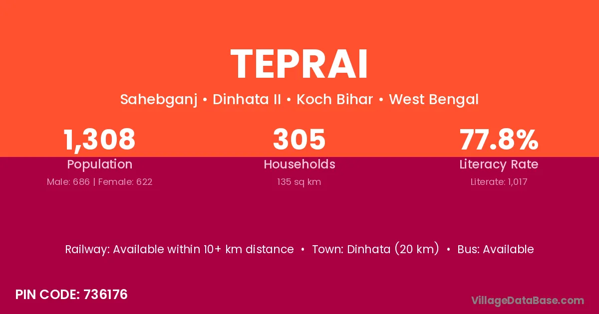 Dinhata (20 km) is the nearest town to Teprai village for major economic activities and is located approximately 20 km away.