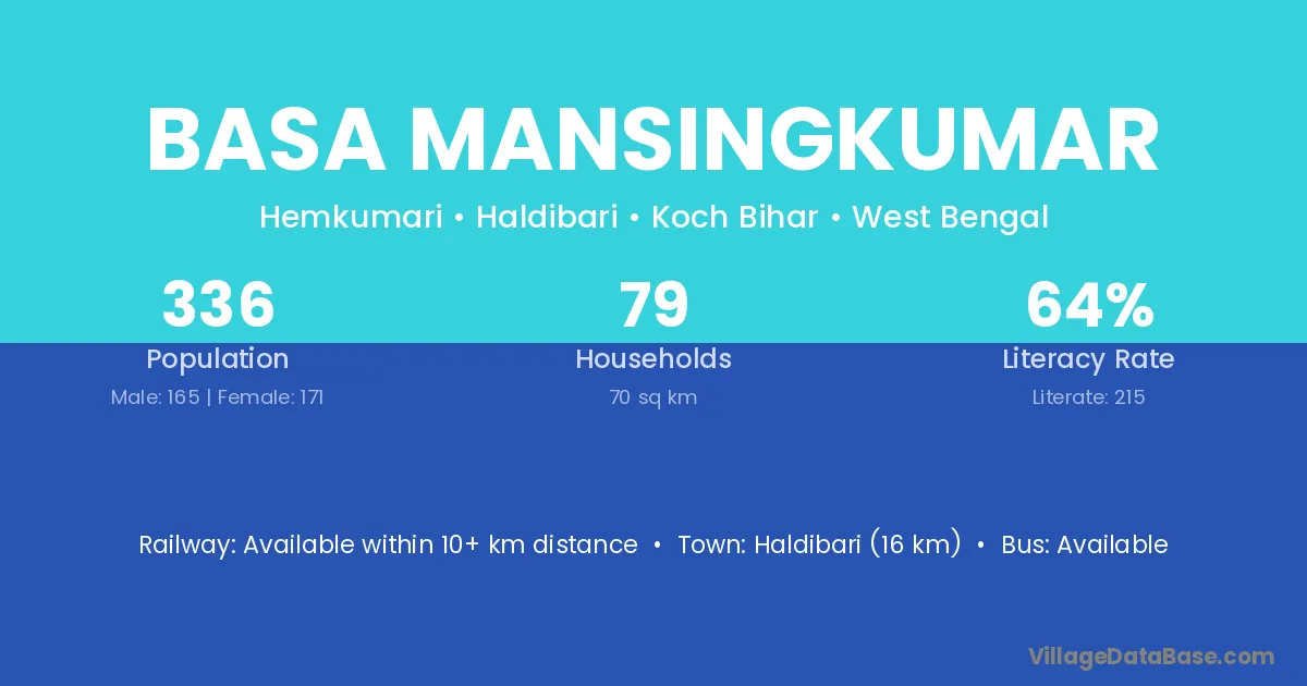 Haldibari (16 km) is the nearest town to Basa Mansingkumar village for major economic activities and is located approximately 16 km away.