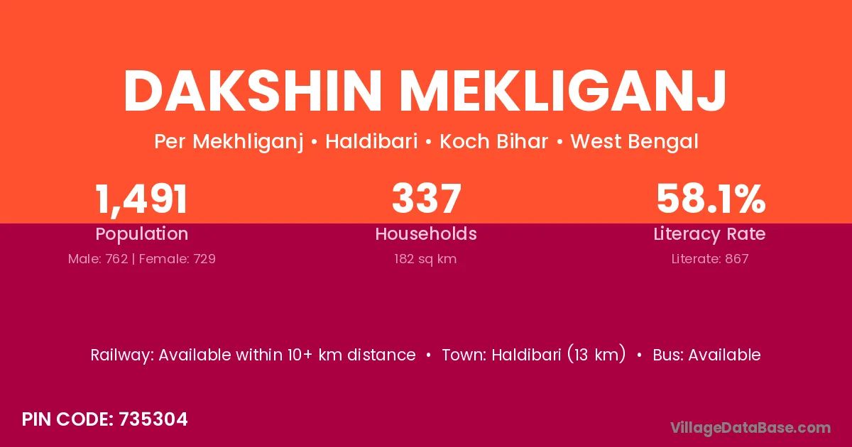 Dakshin Mekliganj village has a total population of 1,491 people, of which 762 are males and 729 are females.