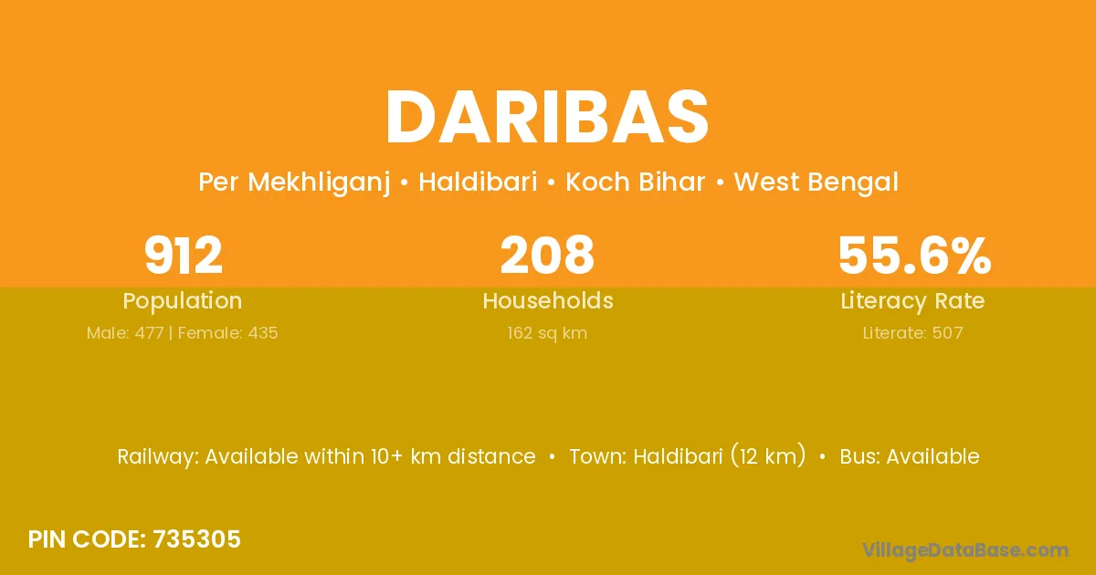 Haldibari (12 km) is the nearest town to Daribas village for major economic activities and is located approximately 12 km away.
