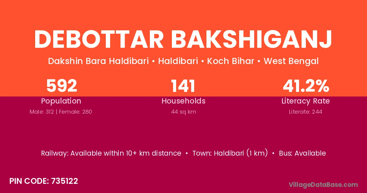 Haldibari (1 km) is the nearest town to Debottar Bakshiganj village for major economic activities and is located approximately 1 km away.