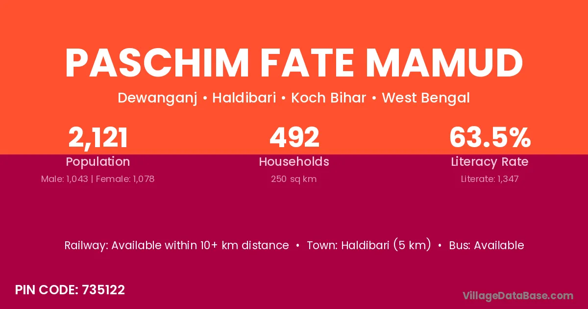 Paschim Fate Mamud village has a total population of 2,121 people, of which 1,043 are males and 1,078 are females.