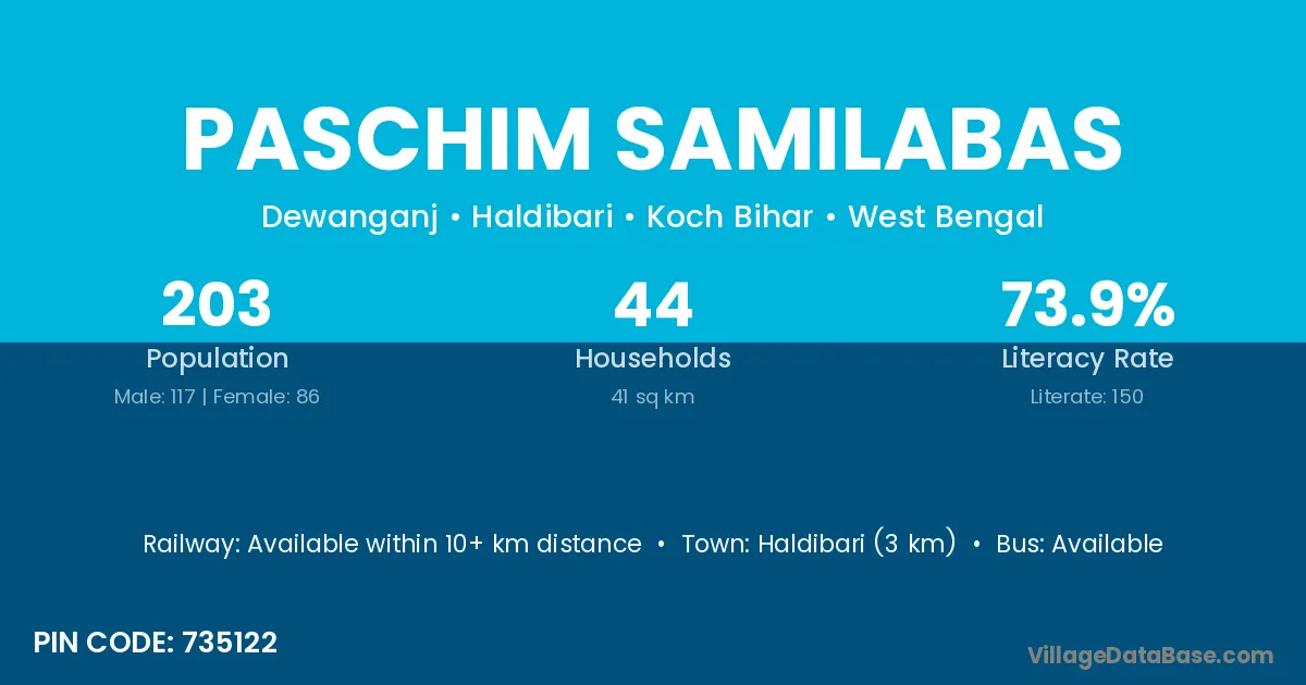 Haldibari (3 km) is the nearest town to Paschim Samilabas village for major economic activities and is located approximately 3 km away.