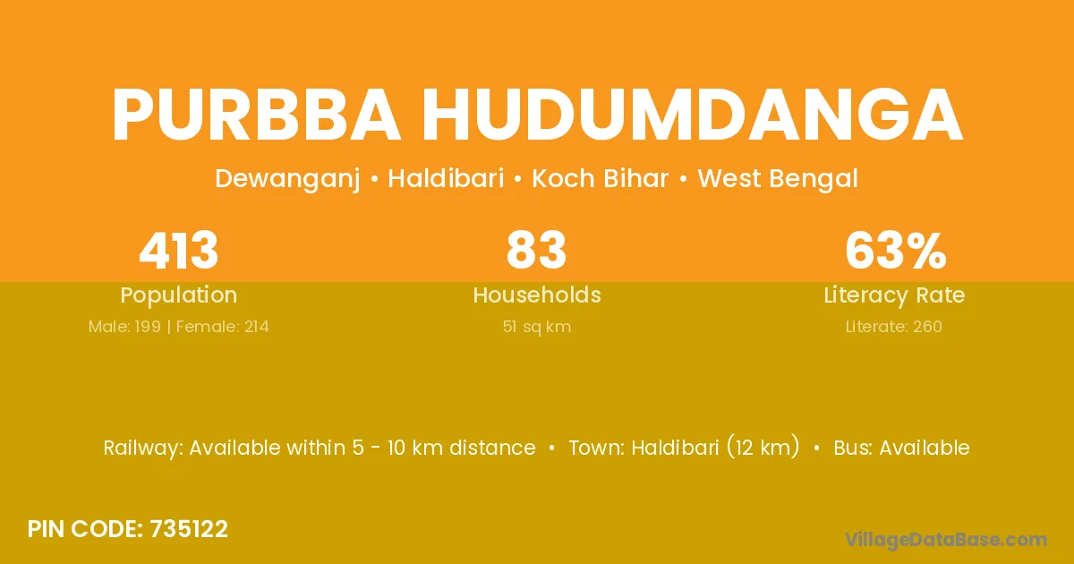 Haldibari (12 km) is the nearest town to Purbba Hudumdanga village for major economic activities and is located approximately 12 km away.